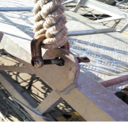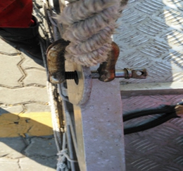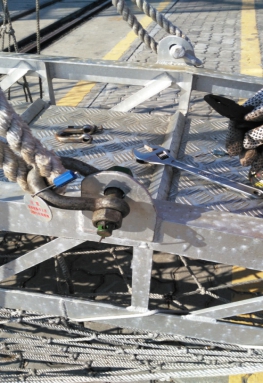 當晚1000時,細心的孫方忠大副在巡視梯口時,發現舷梯的四個懸吊卸扣中,有一個使用的是公司已經明令禁止使用的螺桿卸扣。他走過去一看,驚出一身冷汗,這個卸扣的螺桿已經快脫開了,經仔細檢查發現,此螺桿還剩一圈半的絲扣就會整個脫落。如果沒有在今天及時發現,很可能在之后吊裝舷梯的時候出現重大險情,并可能導致人身傷害甚至威脅人命。