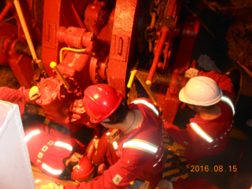在應急情況下勉強起錨,輪機部全體船員利用巡航時間,搶修拆出破損液壓油管補焊。天公不作美,大雨斷斷續續地下著,由于固定油管的螺絲腐蝕變形,修復工作耗費5個多小時才得以完成。
