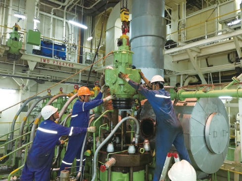 隨著主機慢慢停下,各種工具已準(zhǔn)備妥當(dāng),搶修行動即刻展開。考慮到排氣閥溫度高達80攝氏度,個別部位溫度可能更高的實際情況,為盡可能縮短搶修時間,船員們做好防護措施之后便緊鑼密鼓地投入到搶修工作中。由于船舶漂航,為克服涌浪導(dǎo)致的船舶搖晃給搶修工作帶來影響,搶修人員在排氣閥上綁上繩子,通過人工拉拽來保持相對平衡,避免過度搖晃。經(jīng)過半個多小時的努力,兩個團隊幾乎同時傳來好消息——故障排氣閥已被拆下,備用排氣閥也被轉(zhuǎn)運到現(xiàn)場。整個過程有條不紊、忙而不亂。